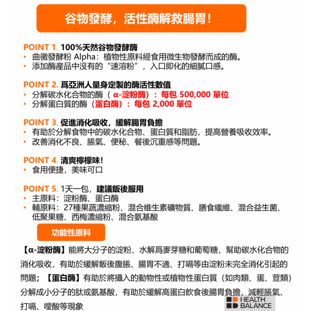 ✔ α-澱粉酶:500,000單位/包 → 分解碳水化合物