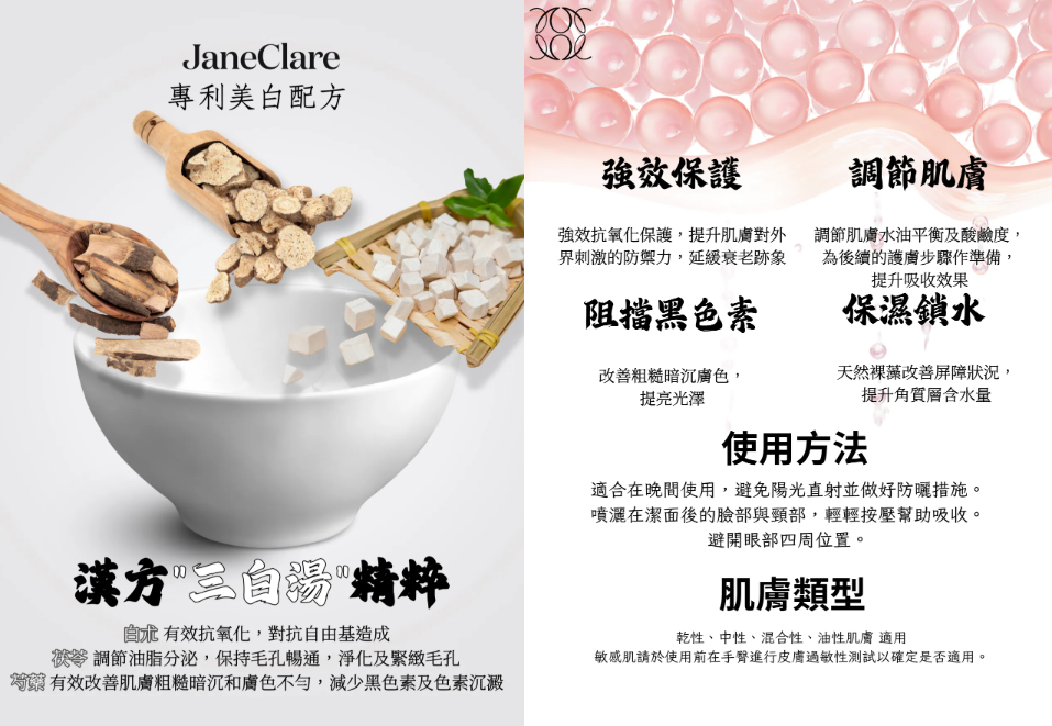 ·芍藥專利美白配方,參照漢方"三白湯"精粹,糅合維生素C、九肽-1等。