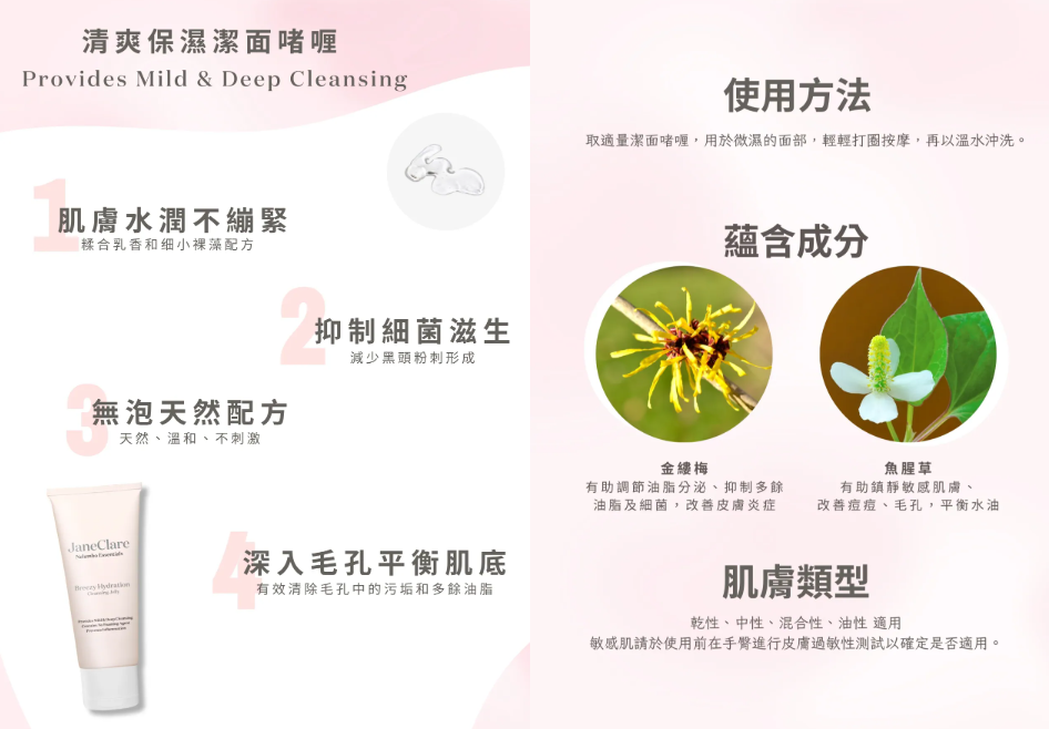 ·金縷梅淨潤無泡配方,糅合魚腥草和仙人掌等茎取