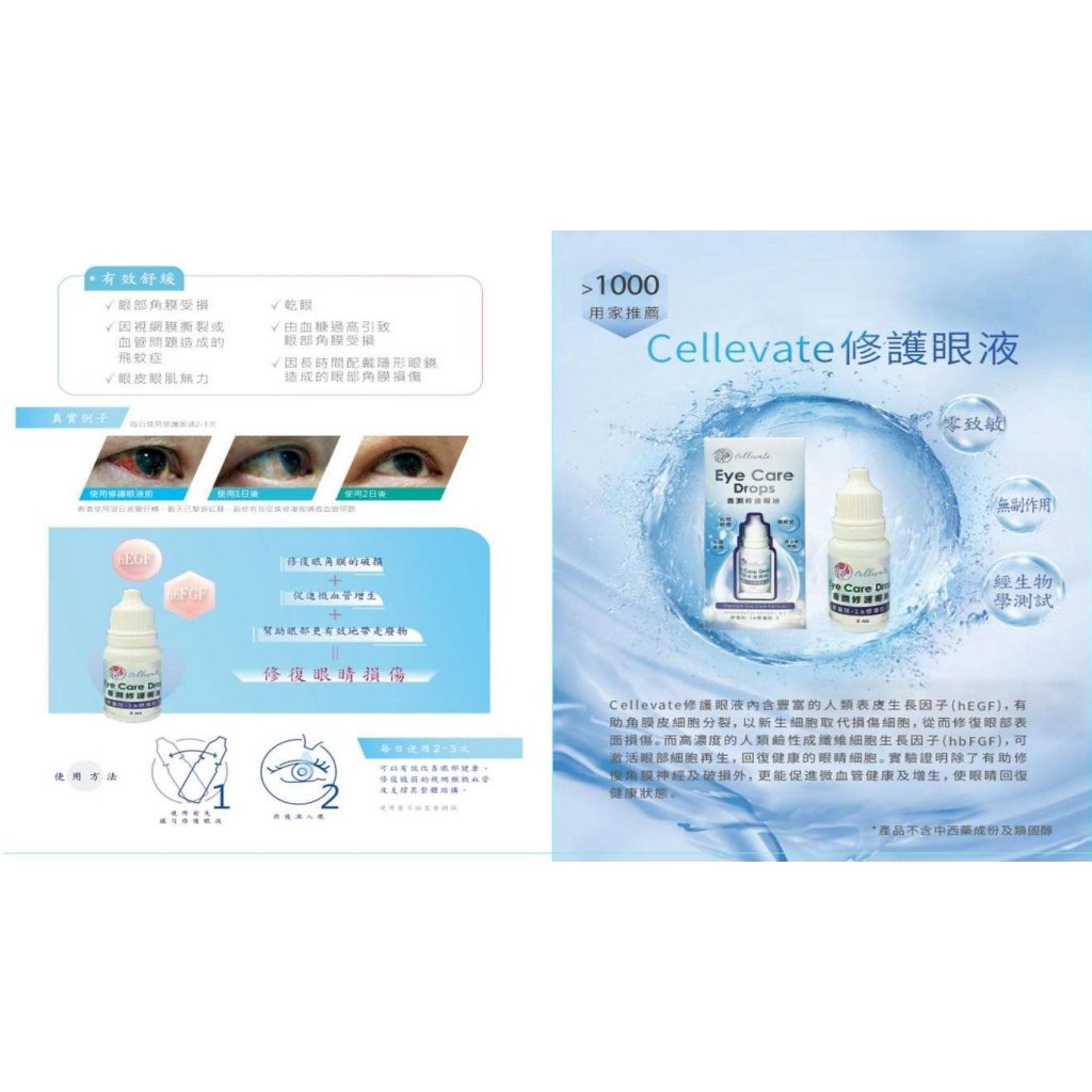 Cellevate護眼液內含豐富的表皮生長因子(EGF),能有助眼角膜上皮細胞分裂,加速膠原蛋白、彈性蛋白合成,從而修復眼部表面的損傷。此外,Cellevate護眼液亦加入高濃度的鹼性成纖維細胞生長因子(bFGF),能激活不同的細胞增生,實驗證明除了有助修復眼角膜神經及破損外,更能促進微血管健康及增生,使眼睛回復健康狀態,有助改善視力、乾眼和眼睛疲勞。